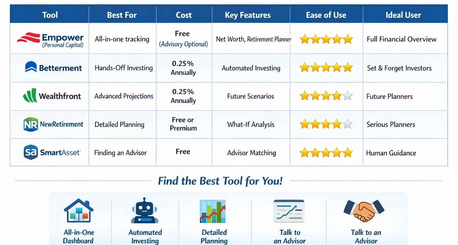 - Empower and SmartAsset are especially beginner-friendly